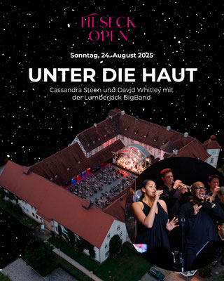 Den Abschluss der Filseck Open 2025 bildet das Konzert „Unter die Haut“, bei dem die gefeierte Sängerin Cassandra Steen gemeinsam mit Musicalstar David Whitley, bekannt aus The Voice of Germany, und der Lumberjack Bigband für Gänsehaut-Momente sorgt. Mit ihrer unverwechselbaren Stimme interpretiert sie ihre eigenen Hits wie „Stadt“ und „Lange genug Zeit“ ebenso wie gefühlvolle Soulklassiker und energiegeladene Duette mit der Bigband.
